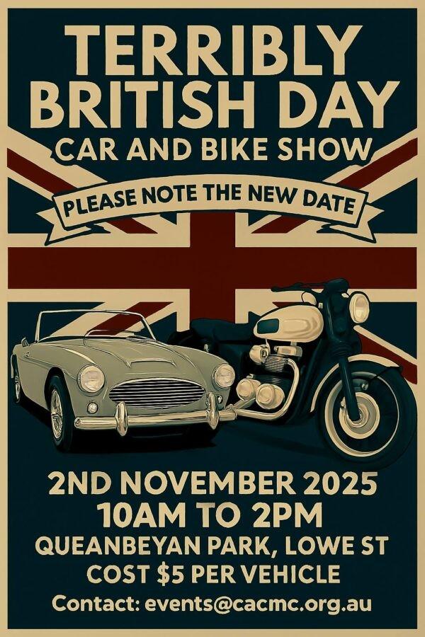 The 2025 Terribly British Day displayt will be held again at Queanbeyan Park iorganised by Canberra Antique and Classic Motor Club, on behalf of the Council of ACT Motor Clubs.